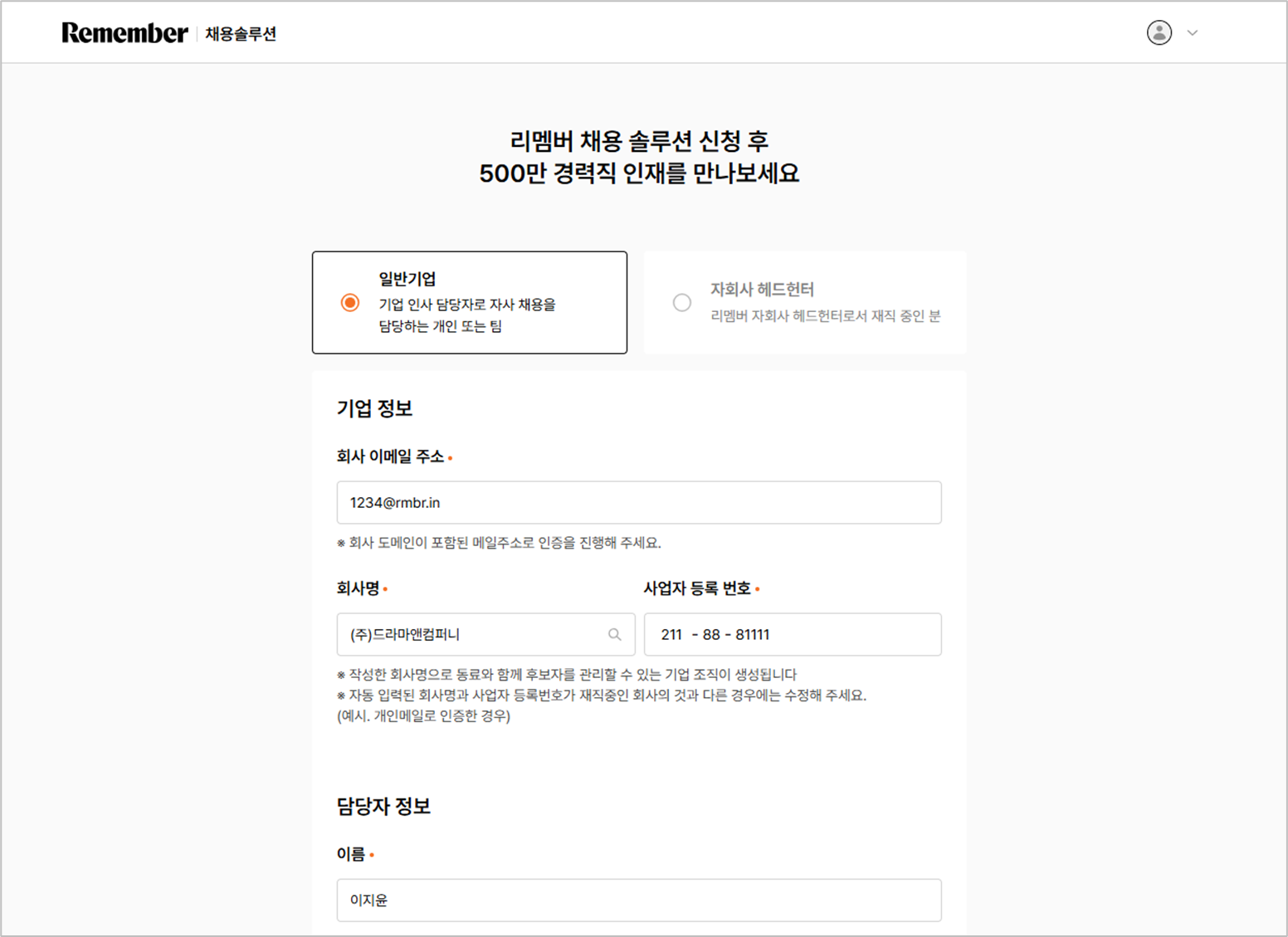 - 처음 채용솔루션을 이용하는 경우, 필수 입력항목을 입력 후 리크루터 신청 완료