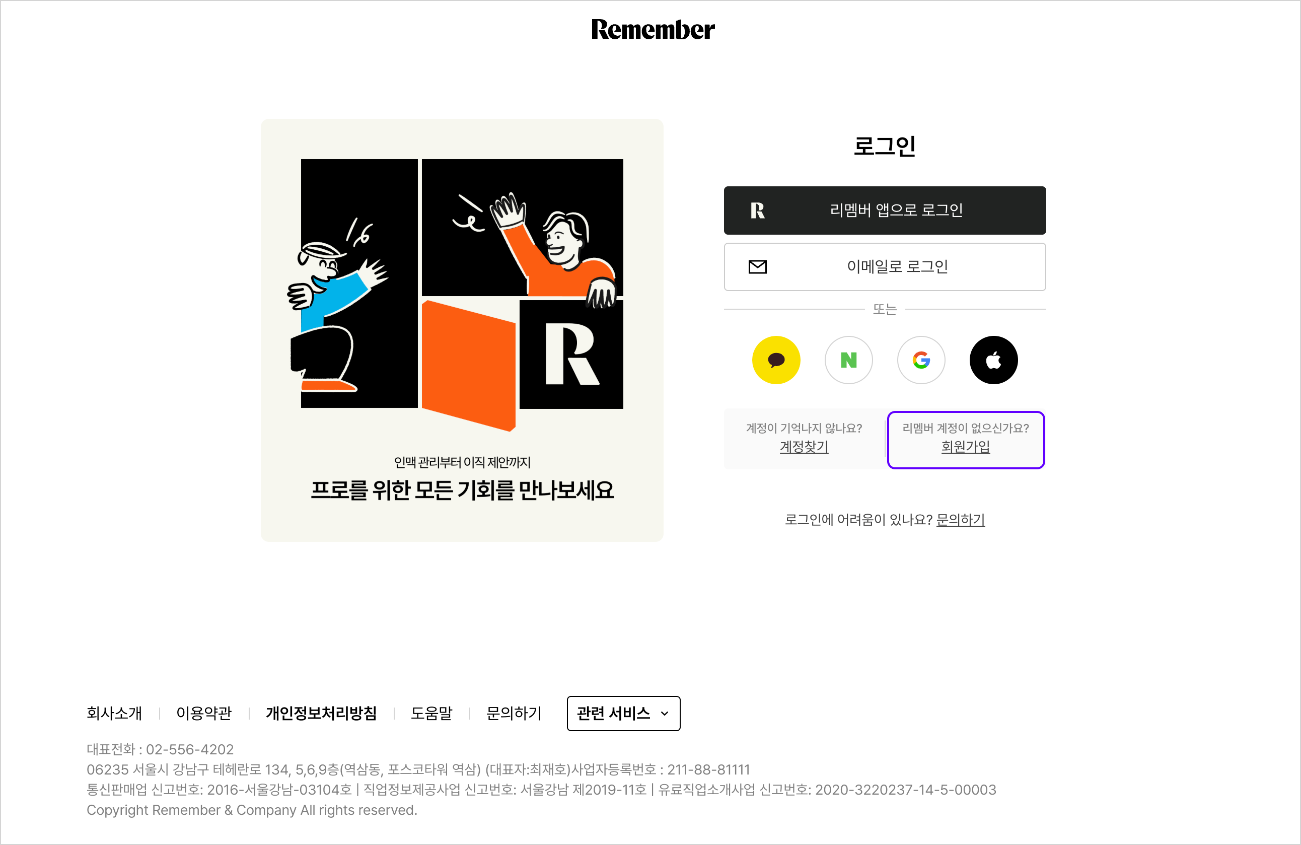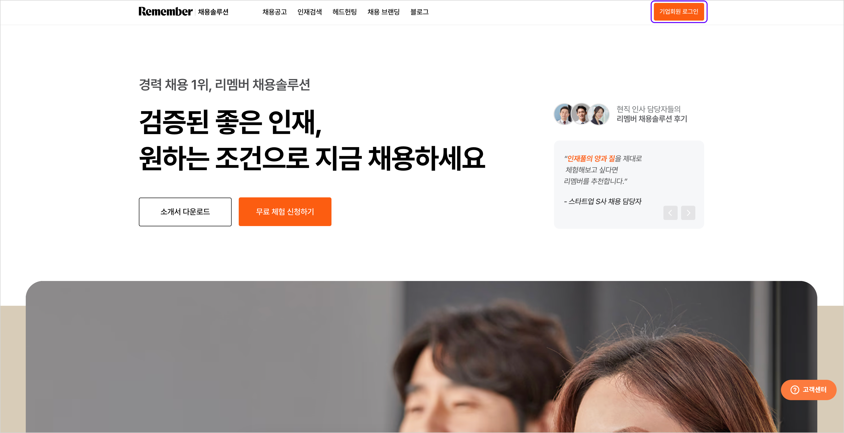 - 리멤버 채용솔루션 페이지 접속 → (우측 상단) [기업 서비스] 클릭