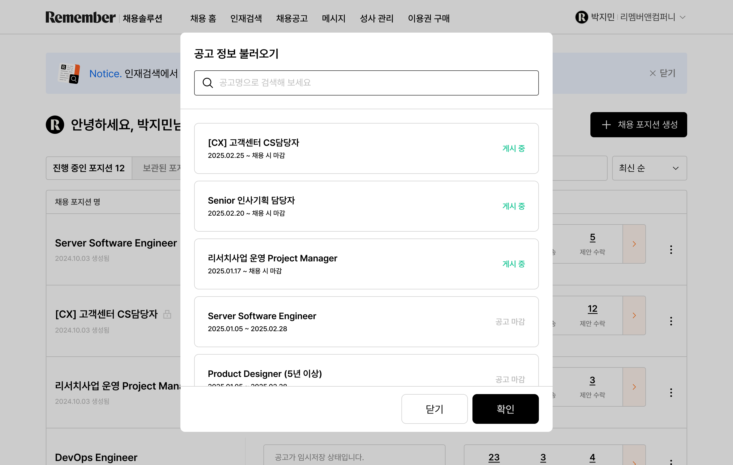 - 불러올 공고 클릭 → [확인] 버튼 클릭