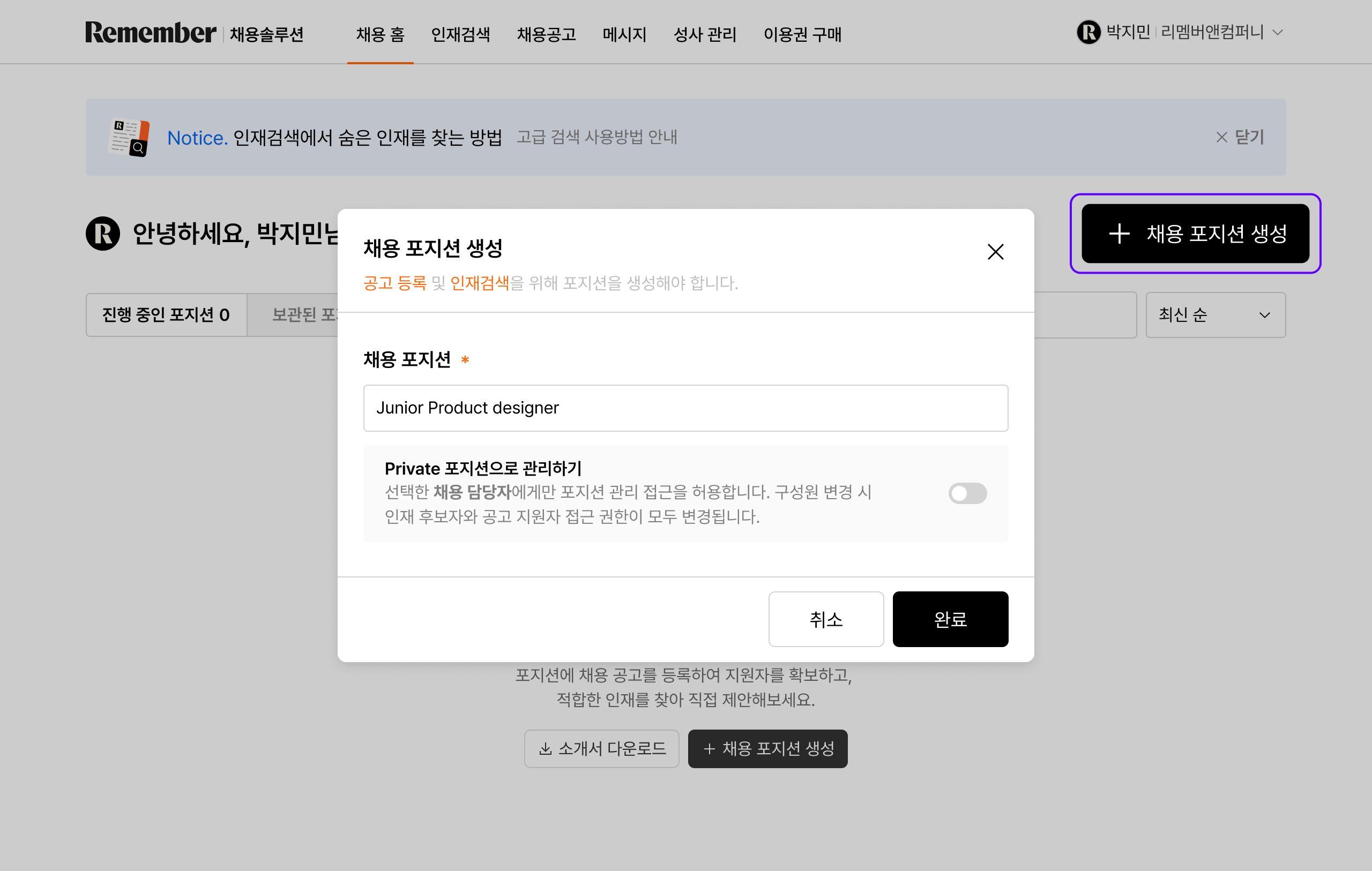 - [채용홈] > [채용 포지션 생성] 선택