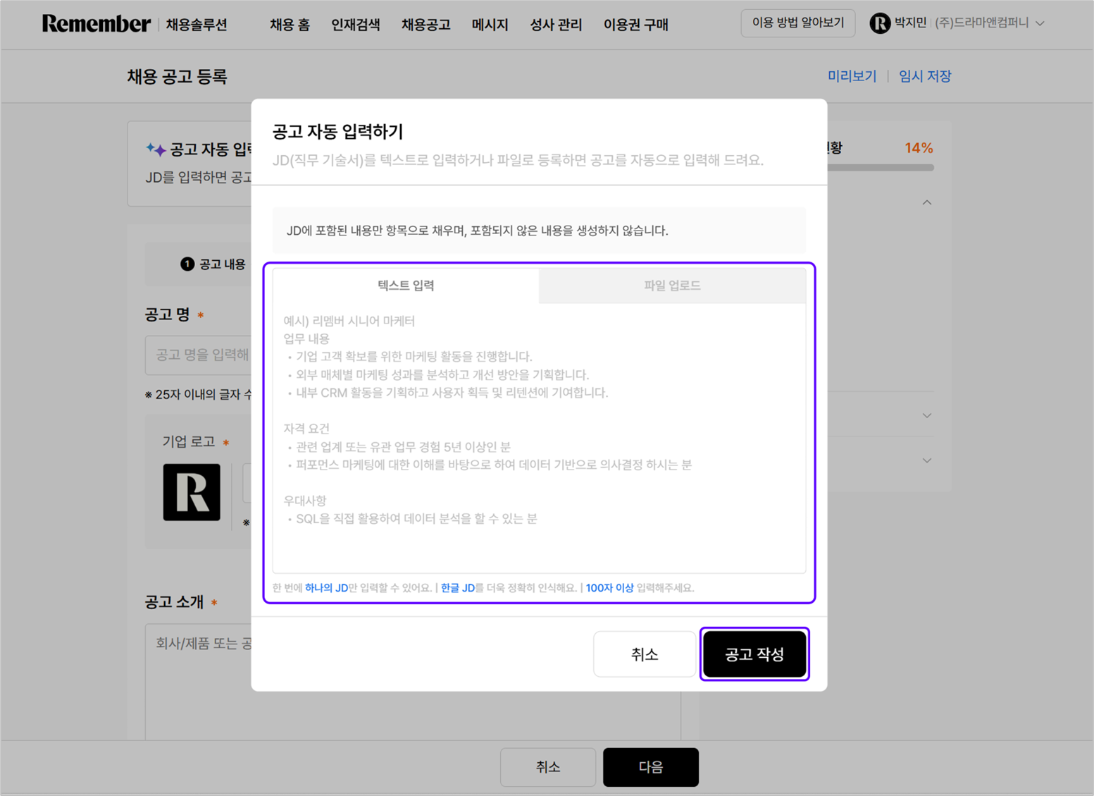 타 플랫폼에 게시된 공고의 JD를 텍스트로 입력하면 공고를 더 빠르게 등록할 수 있습니다!