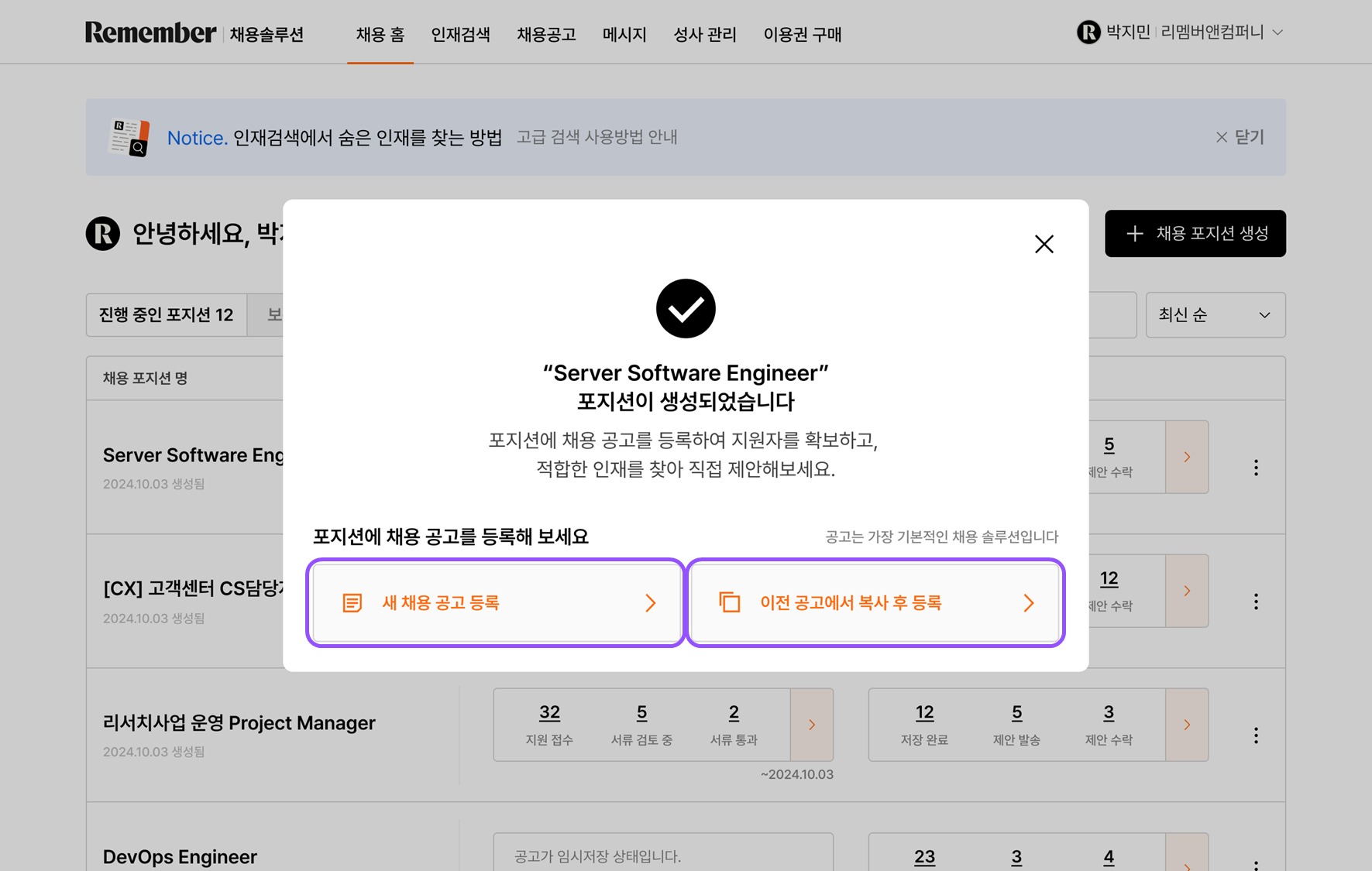 - 공고를 등록하거나 수정하면 'AI 채용비서'가 회사/포지션 별로 리멤버에 축적된 데이터를 학습하여 채용 가능성이 높은 후보자를 추천해 드립니다.