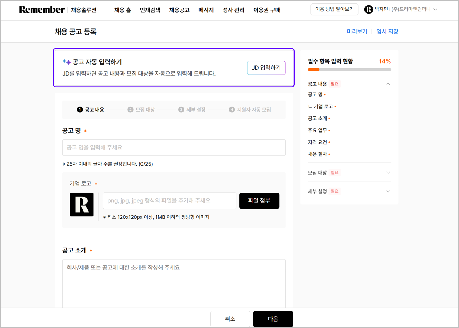 - 새 채용 공고 등록 > [JD 입력하기] 선택