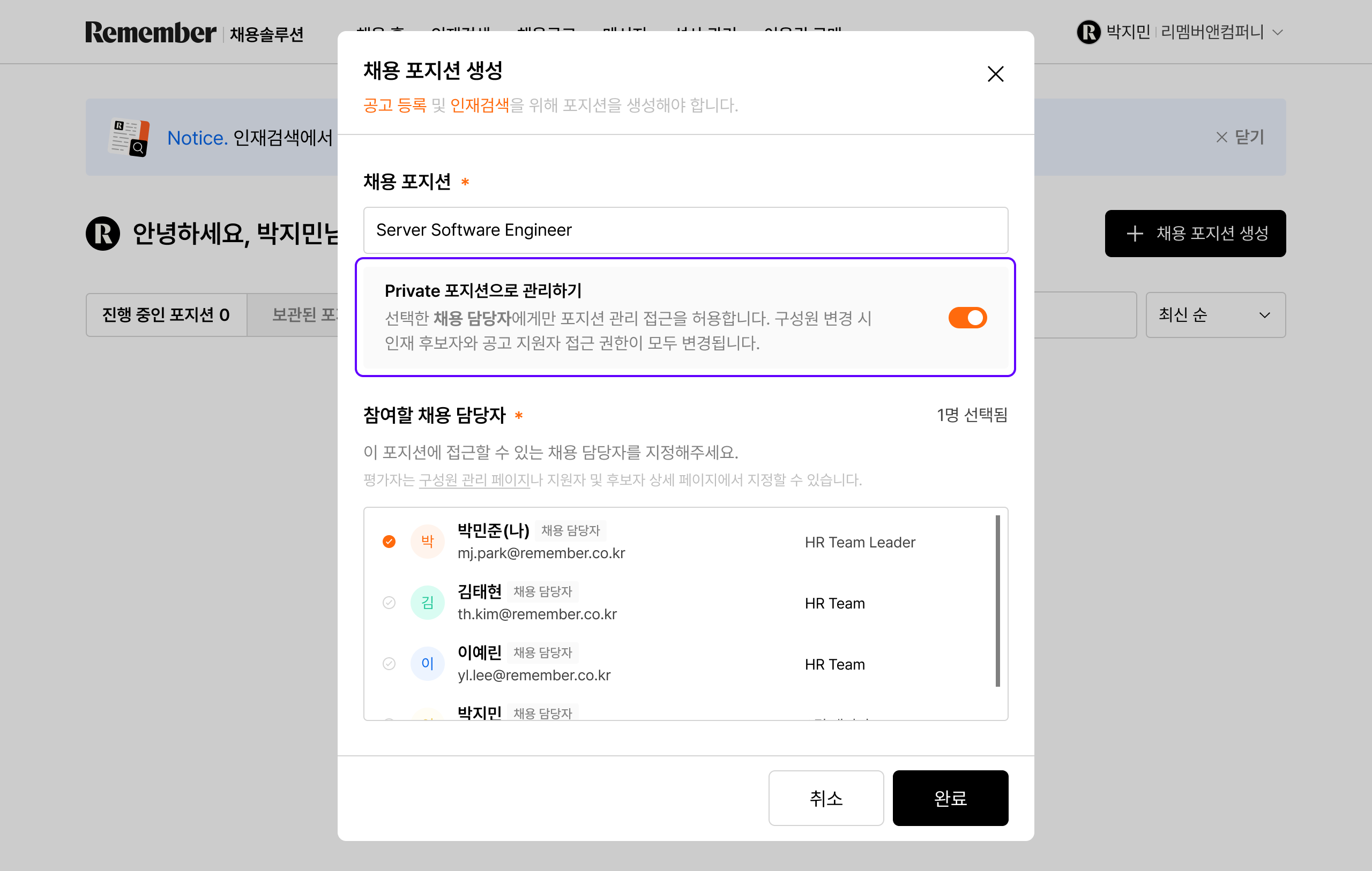 - [채용 홈] > 채용 포지션 생성 > [Private 포지션으로 관리하기] 선택