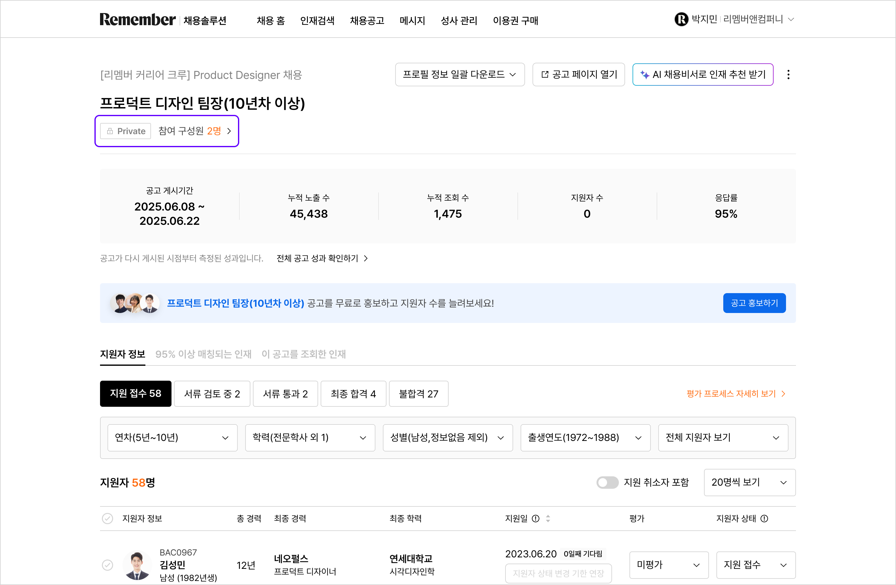 - 공고 상세페이지의 [포지션 구성원 관리] 선택