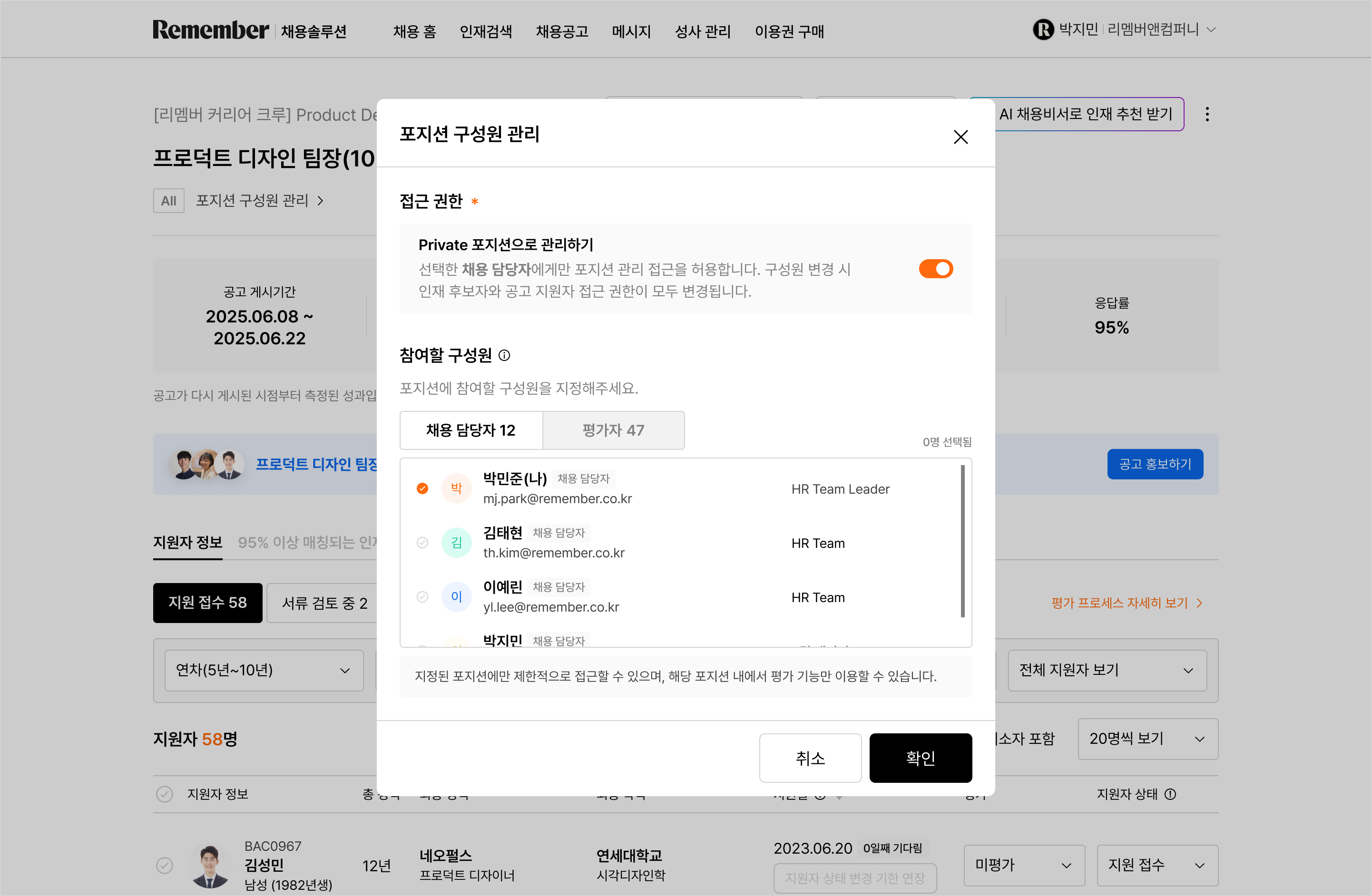 - [채용 홈] 또는 [채용공고]에서 통해 권한을 설정하고자 하는 공고 선택