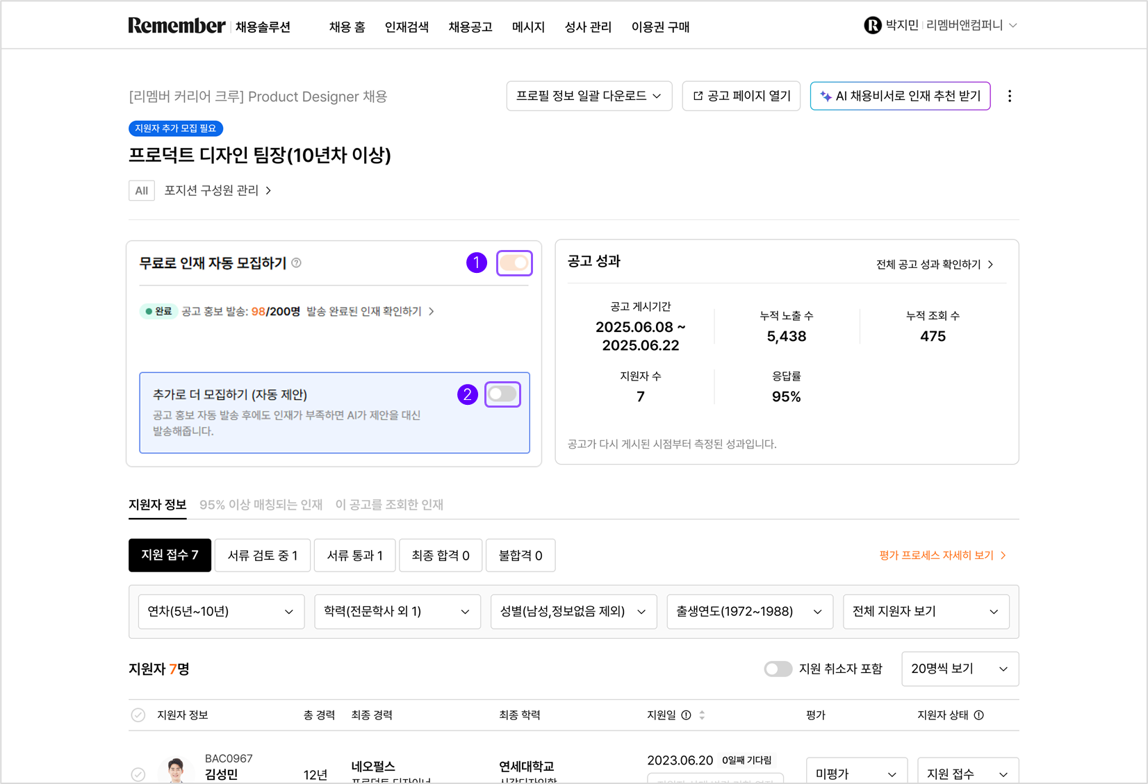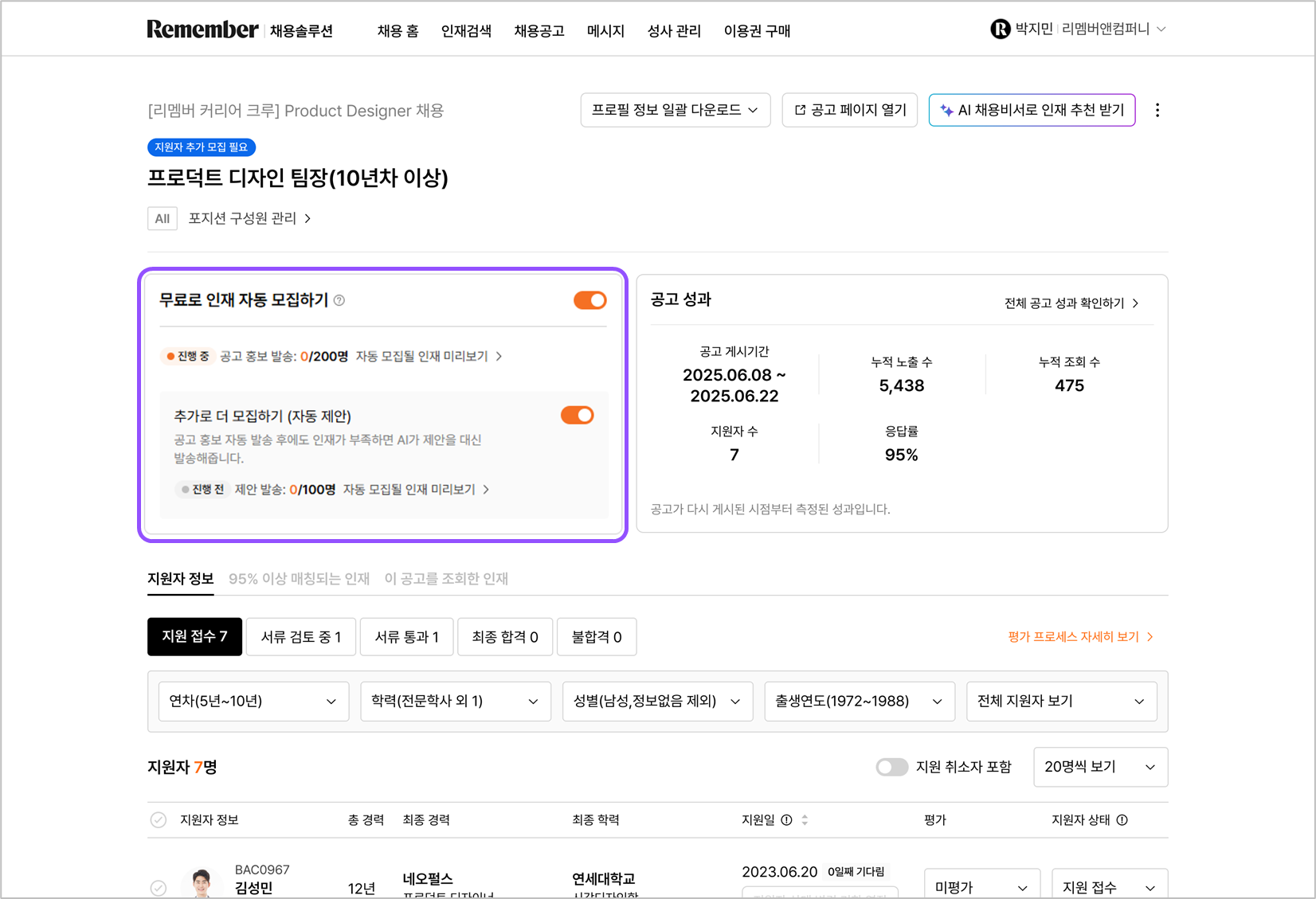 - 지원자 자동 모집 활성화여 무료로 추가 지원자를 확보해 보세요 : 인재 자동 모집 기능을 사용할 수 있는 공고