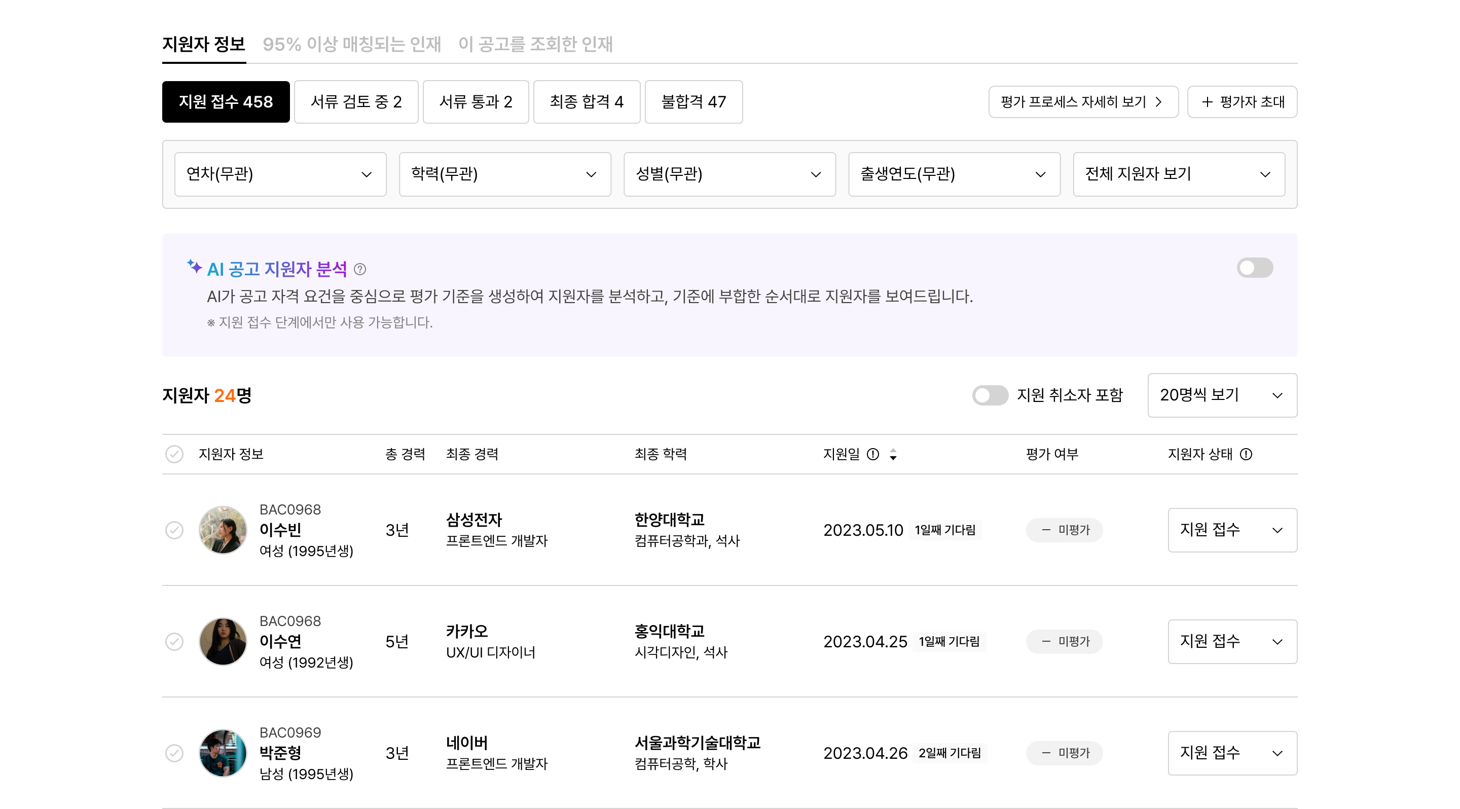AI 공고 지원자 분석 기능은 지원 접수 단계 지원자에게만 적용됩니다.
