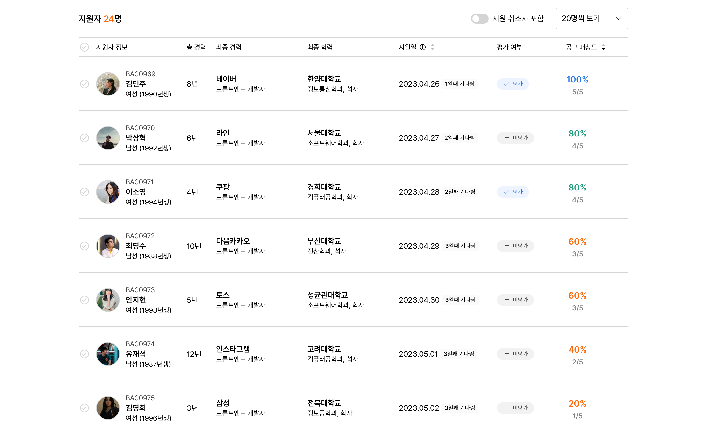 지원자 리스트는 더 많은 기준을 만족한 지원자가 상단에 노출되도록 기본 정렬됩니다.