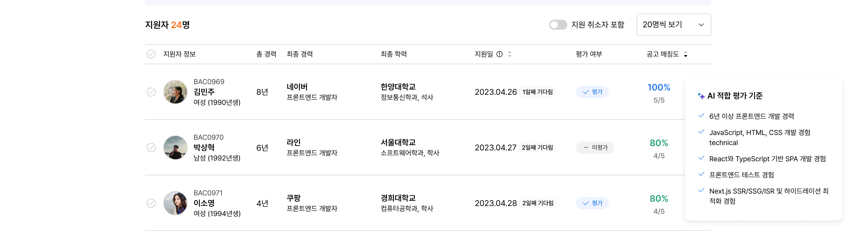 매칭도가 높은 지원자를 우선 검토하고, 매칭도가 낮은 지원자를 빠르게 선별하여 평가 업무 생산성을 높여보세요!