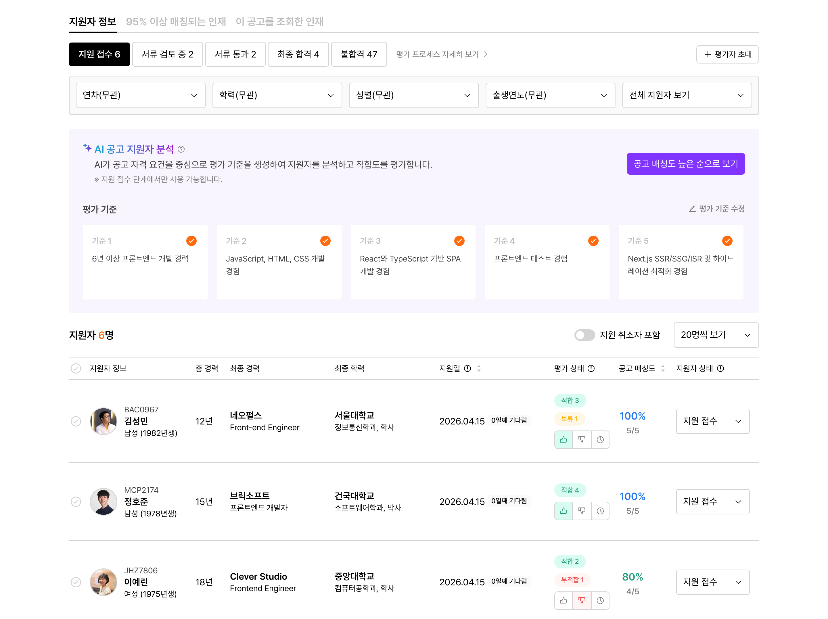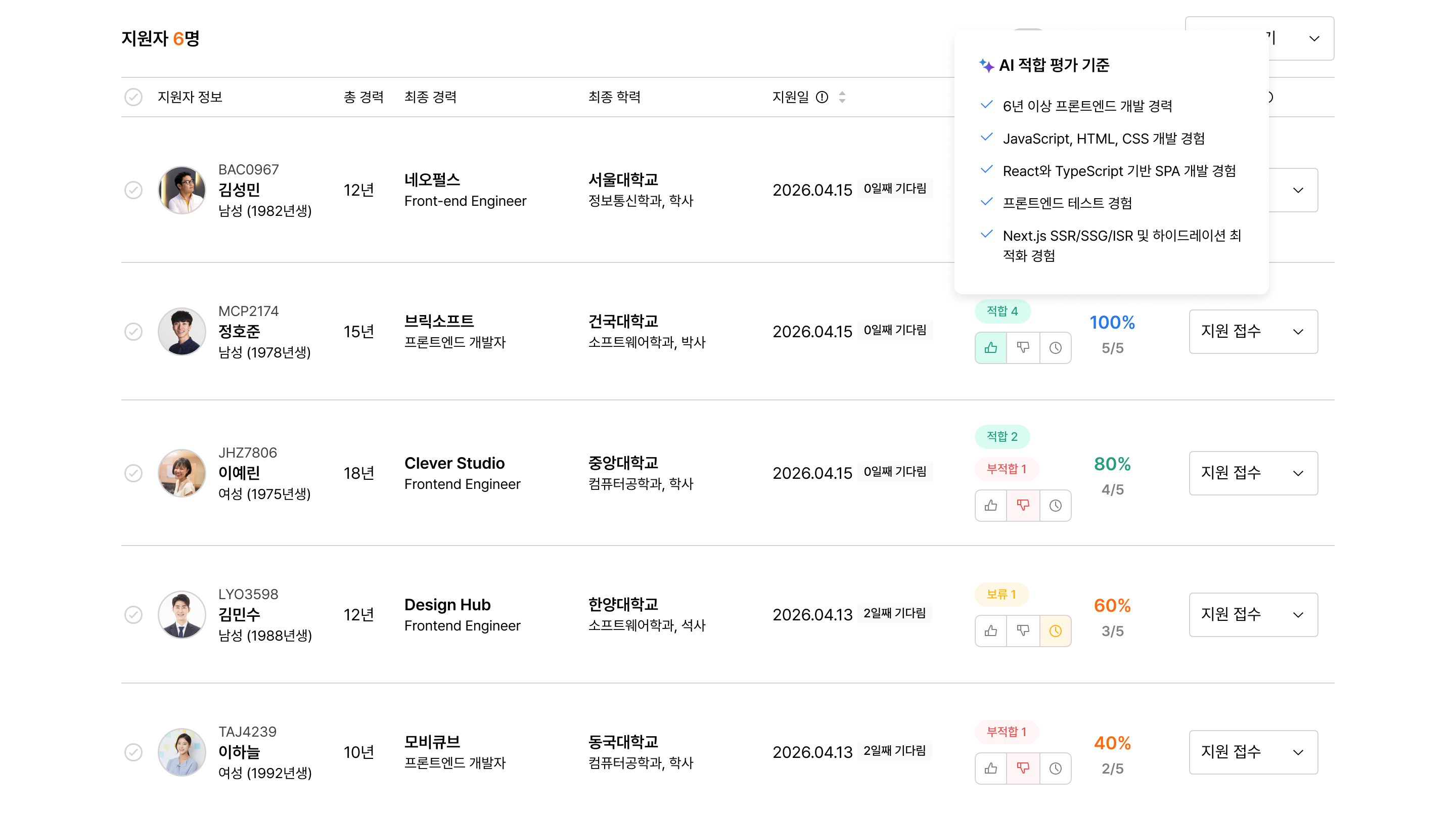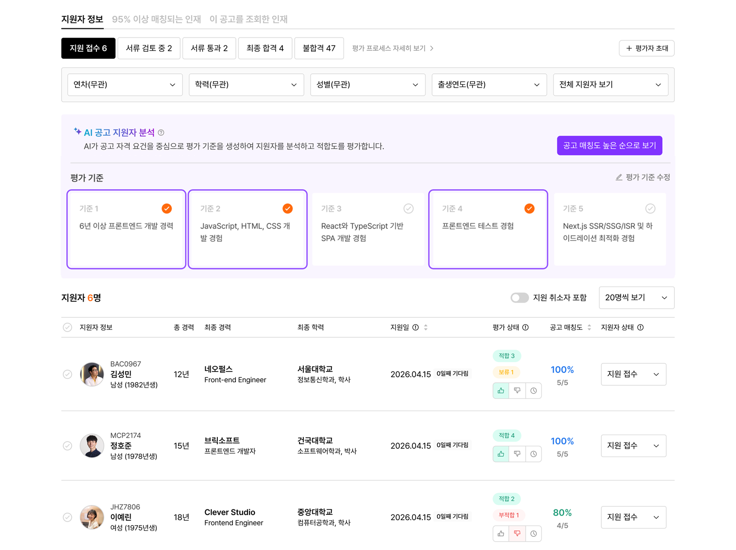 리스트에서 지원자별 각 기준 충족 현황을 바로 확인할 수 있습니다.
