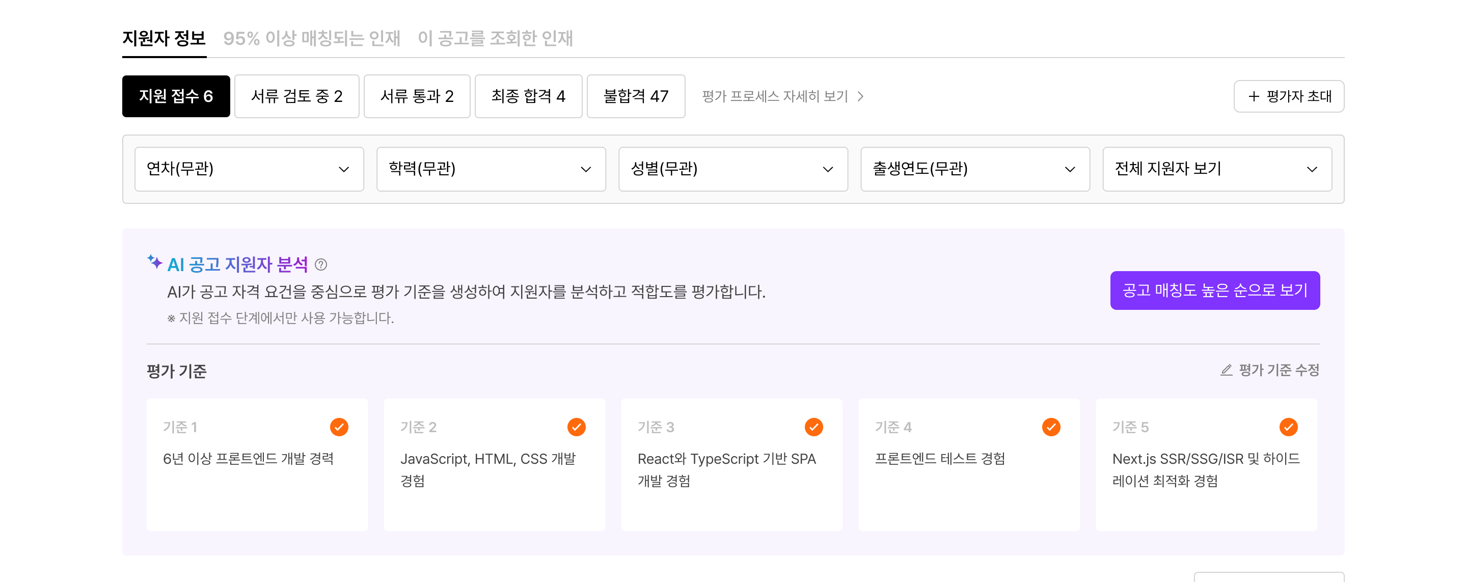 해당 기준에 맞지 않는 지원자는 상세 프로필 열람 없이도 빠르게 검토를 진행할 수 있습니다.