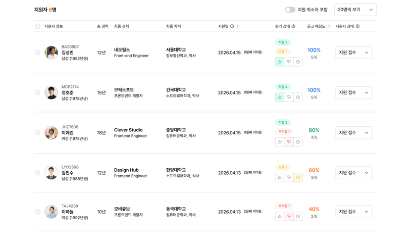 상단 지원자부터 우선 검토해 보세요.